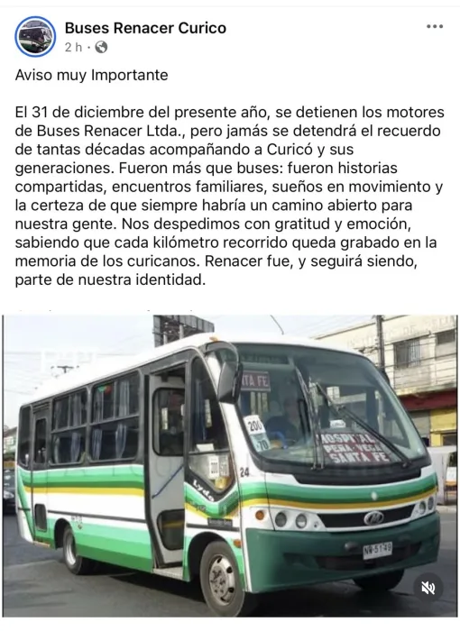 Este martes 2 de diciembre, la empresa de transporte urbano Buses Renacer informó oficialmente que sus máquinas dejarán de circular en la ciudad de Curicó a contar del 31 de diciembre, poniendo término definitivo a sus operaciones en los distintos recorridos que mantenía dentro del radio urbano.