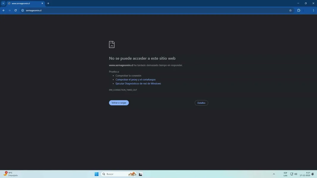 SANTIAGO, CHILE – El Servicio Nacional de Geología y Minería (Sernageomin) informó que fue víctima de un ataque informático que provocó la interrupción temporal de su sitio web institucional y de diversas plataformas digitales internas, vinculadas a las áreas de geología y minería, situación que a las 06:00 horas de la mañana de este miércoles 17 de diciembre se mantenía sin solución, con el portal aún inaccesible.