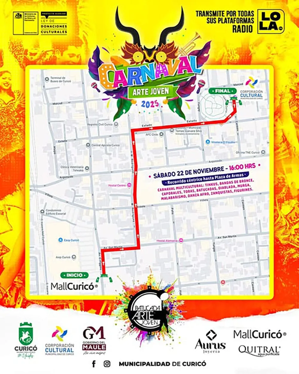 Organizado por Batucada Arte Joven y la Corporación Cultural de Curicó, el carnaval promete convertirse en uno de los hitos comunitarios más coloridos del año. La transmisión oficial estará a cargo de Radio Lola, que emitirá en vivo a través de todas sus plataformas, mientras que la animación estará en manos de Yannina Campillay.