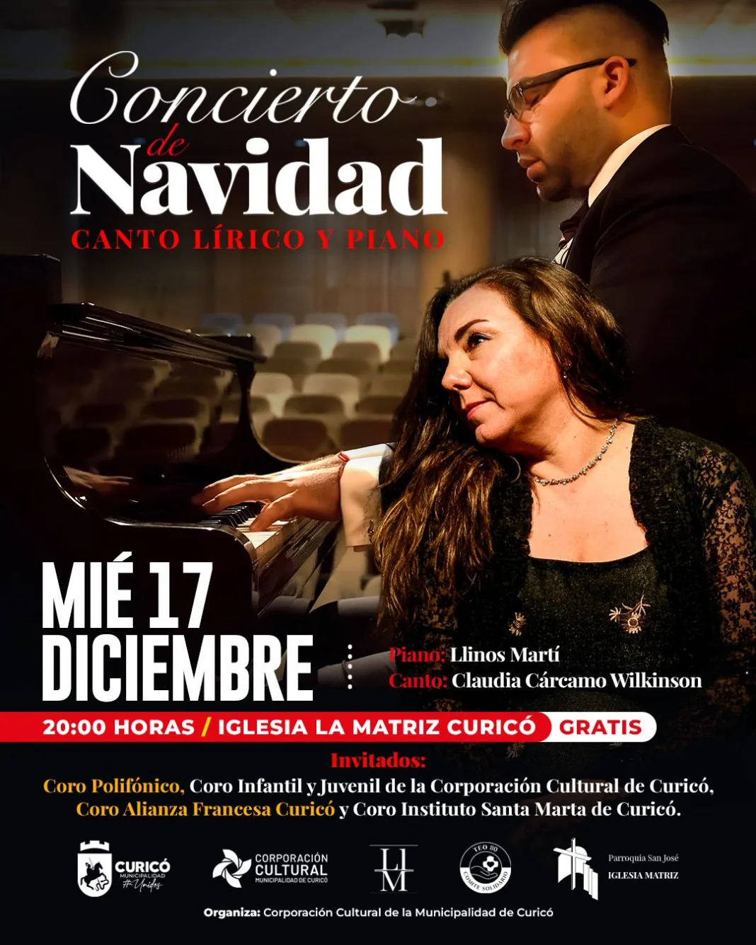 En el concierto participarán el Coro de Niños de la Corporación Cultural de Curicó, el Coro de Niñas del Instituto Santa Marta de Curicó, el Coro de Adultos del Colegio Alianza Francesa Jean Mermoz (Curicó) y el Coro Polifónico de la Corporación Cultural de Curicó. La velada contará, además, con la presentación del pianista Llinos Martí y la cantante lírica Claudia Cárcamo Wilkinson. La actividad es gratuita y se desarrolla gracias al trabajo conjunto de la Corporación Cultural de la Municipalidad de Curicó, el Comité Solidario Teo 80 y la comunidad de la Iglesia Matriz.