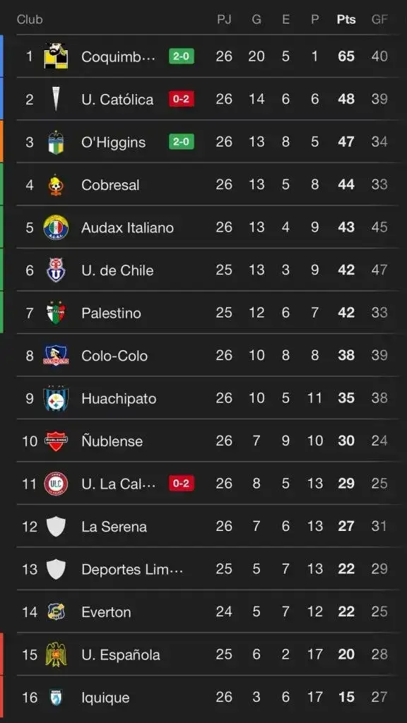 Con este resultado, el conjunto coquimbano alcanzó 65 puntos, asegurando el campeonato cuatro fechas antes del final, igualando el récord histórico de Palestino 1955 y Universidad Católica 1987, que también se consagraron de manera anticipada.