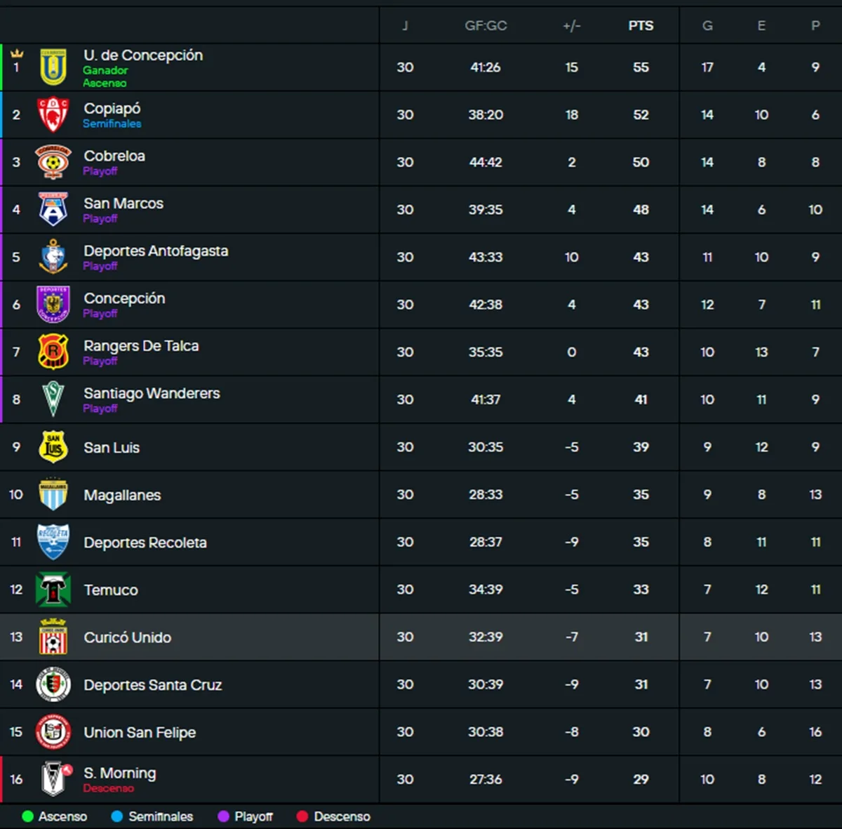 En tanto, Cobreloa alcanzó 53 puntos y finalizó segundo en la tabla, asegurando su paso directo a las semifinales de la liguilla de ascenso. El elenco dirigido por Rodrigo Meléndez aguarda la resolución del castigo a Santiago Morning, que podría modificar el orden definitivo de clasificación.