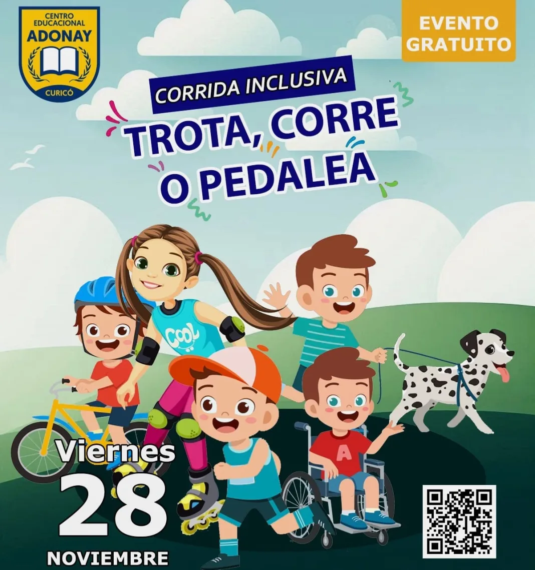 CURICÓ, REGIÓN DEL MAULE – Este viernes 28 de noviembre, desde las 18:30 horas, el Centro Educacional Adonay desarrollará la actividad recreativa “Trota, corre o pedalea”, una invitación abierta para que familias, vecinos y asistentes disfruten de una experiencia deportiva marcada por la energía, la vida sana y la participación inclusiva. La iniciativa cuenta con el respaldo de diversas organizaciones y busca convertirse en un punto de encuentro comunitario en el sector de Rauquén.