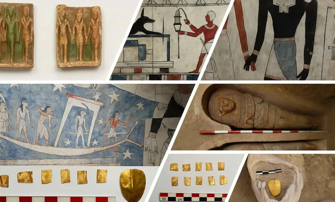 Entre los hallazgos destacan tres lenguas de oro y una de cobre, elementos asociados a rituales funerarios destinados, según las creencias de la época, a facilitar la comunicación de los difuntos en el más allá. También se recuperaron restos humanos, huesos de bebés, una cabeza de felino envuelta en tela y estatuillas de Harpócrates y Cupido, además de jarras utilizadas para almacenar restos humanos y animales.