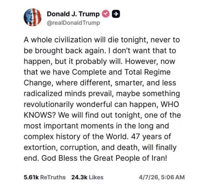 A través de su cuenta en Truth Social, el mandatario sostuvo. “Toda una civilización morirá esta noche para no volver jamás. No quiero que eso suceda, pero probablemente sucederá”, agregando que la situación podría definirse en las próximas horas.