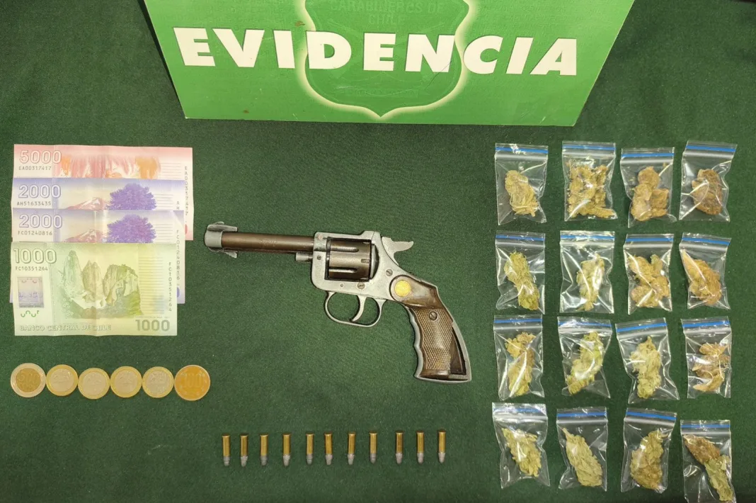 Al advertir la presencia policial, los vehículos que se encontraban en el sector intentaron huir, logrando Carabineros interceptar uno de ellos y fiscalizar a sus ocupantes. Durante la revisión del móvil, se encontró un arma de fuego tipo revólver con seis cartuchos, además de cinco cartuchos sin percutar, marihuana dosificada y dinero en efectivo, motivo por el cual se concretó la detención de los ocupantes.