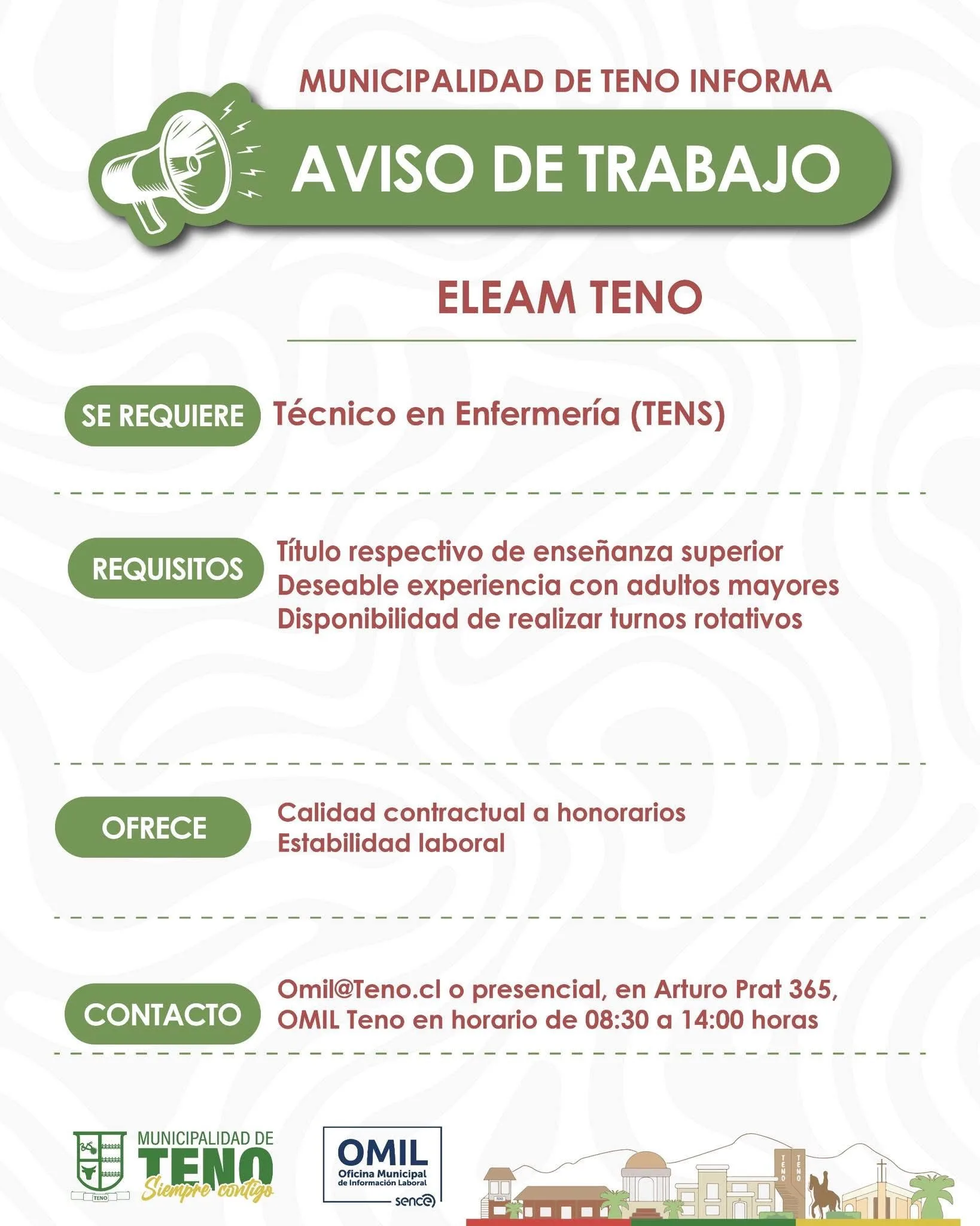 El pasado 23 de enero, el municipio difundió un aviso laboral solicitando personal para el ELEAM, específicamente para el cargo de Técnico en Enfermería (TENS), ofreciendo contratación a honorarios y estabilidad laboral, lo que refuerza el vínculo administrativo del recinto con la casa consistorial.