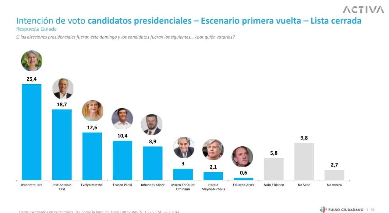 En segunda vuelta, Kast vencería a Jara por 46% a 35%, mientras Matthei también la superaría 43% a 33%. Solo en el escenario con Franco Parisi, la diferencia se reduce a 33% vs 31%.