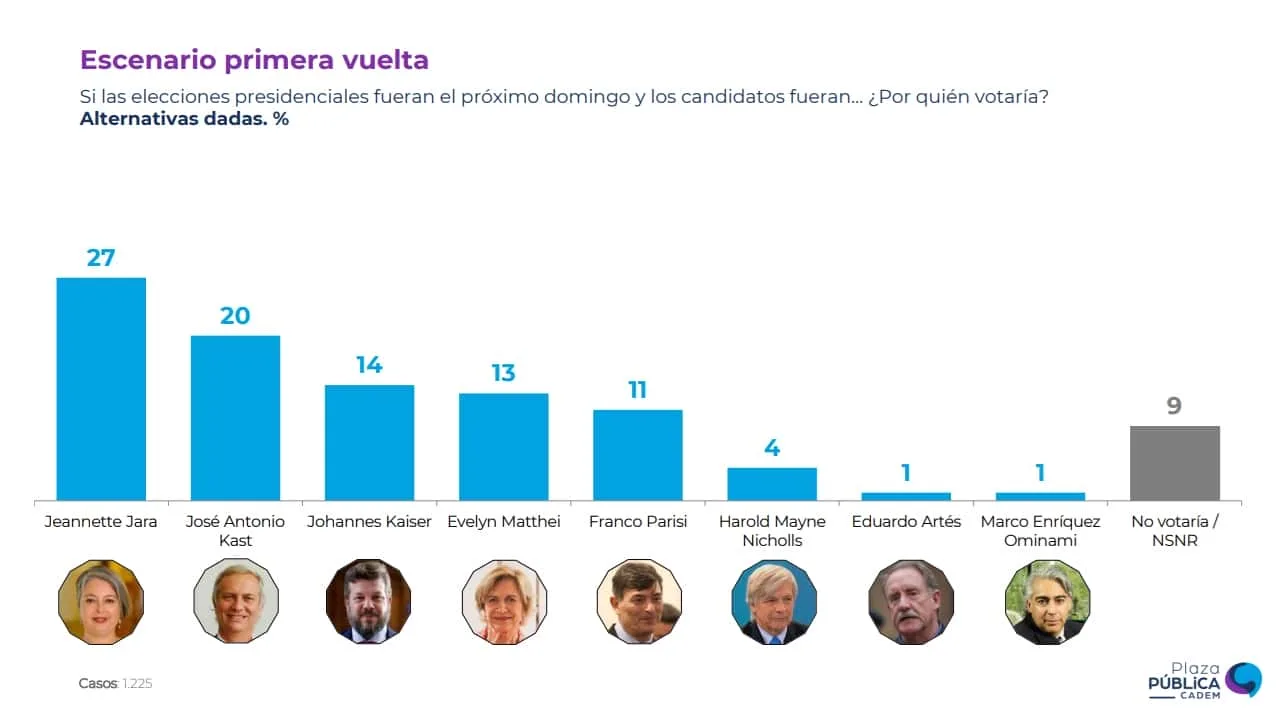 Según la medición de Cadem Plaza Pública, publicada el 26 de octubre, Jeannette Jara obtiene 30% (+1 punto), seguida por José Antonio Kast (22%, -2 pts), Johannes Kaiser (15%, +2 pts), Evelyn Matthei (14%, -2 pts) y Franco Parisi (12%). Más atrás se ubican Harold Mayne-Nicholls (5%), Eduardo Artés (1%) y Marco Enríquez-Ominami (1%).