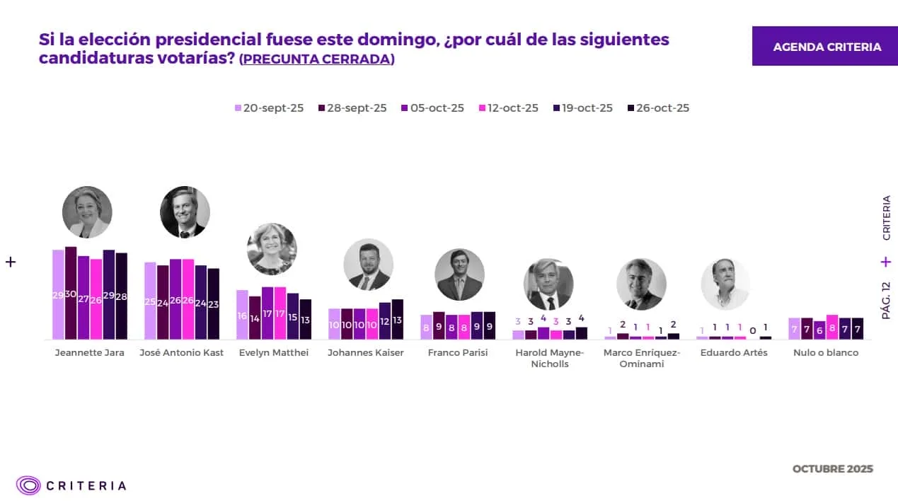 El estudio de Criteria, también publicado el 26 de octubre, muestra un escenario similar: Jara 28% (-1), Kast 23% (-1), Matthei 13% (-2), Kaiser 13% (+1), Parisi 9%, Mayne-Nicholls 4% (+1), Enríquez-Ominami 2% (+1) y Artés 1% (+1).