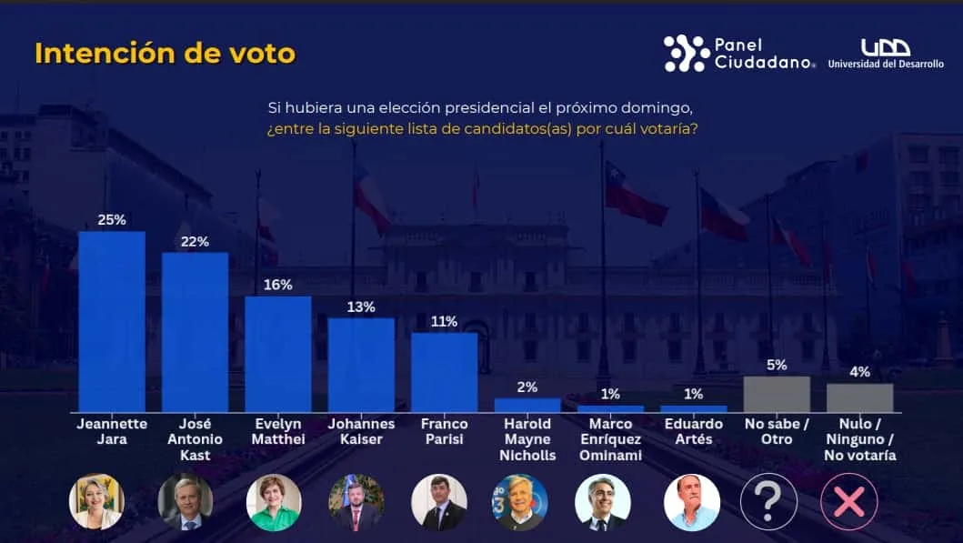 El Panel Ciudadano de la Universidad del Desarrollo, publicado el 24 de octubre, sitúa a Jara con 25%, Kast con 22% y Matthei con 16%. Más atrás figuran Kaiser (13%), Parisi (11%), Mayne-Nicholls (2%), Enríquez-Ominami (1%) y Artés (1%).