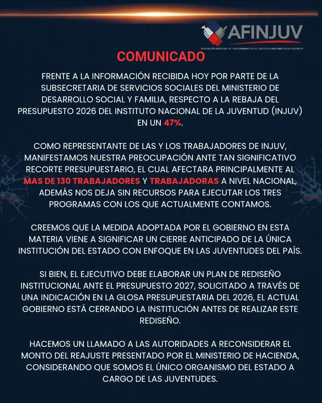 SANTIAGO, CHILE – El Ministerio de Desarrollo Social y Familia anunció el inicio de un proceso de estudio y diseño de una nueva institucionalidad de la juventud, en medio de una rebaja presupuestaria del 47% al Instituto Nacional de la Juventud (Injuv), medida que forma parte del ajuste fiscal transversal del 3% aplicado al sector público.
