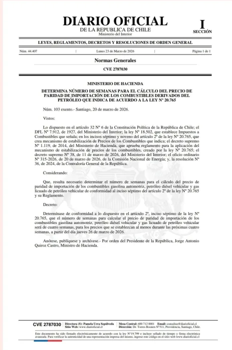 SANTIAGO, CHILE – El Ministerio de Hacienda concretó la mañana de este lunes la publicación en el Diario Oficial del decreto que establece el primer ajuste al mecanismo utilizado para calcular los precios de los combustibles en el país, en un contexto marcado por el debate ante el alza del petróleo a nivel internacional.