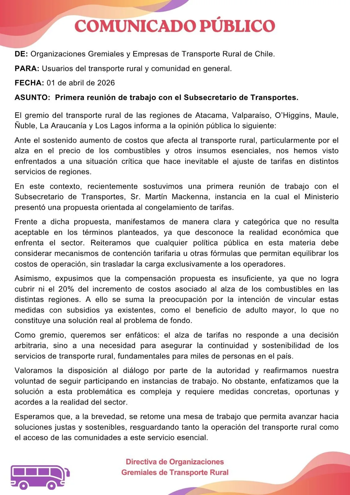 El planteamiento fue dado a conocer a través de un comunicado público emitido el 1 de abril, tras la primera reunión sostenida con el Subsecretario de Transportes, Martín Mackenna, instancia en la que el Gobierno propuso un congelamiento de tarifas, medida que fue considerada insuficiente por el gremio.