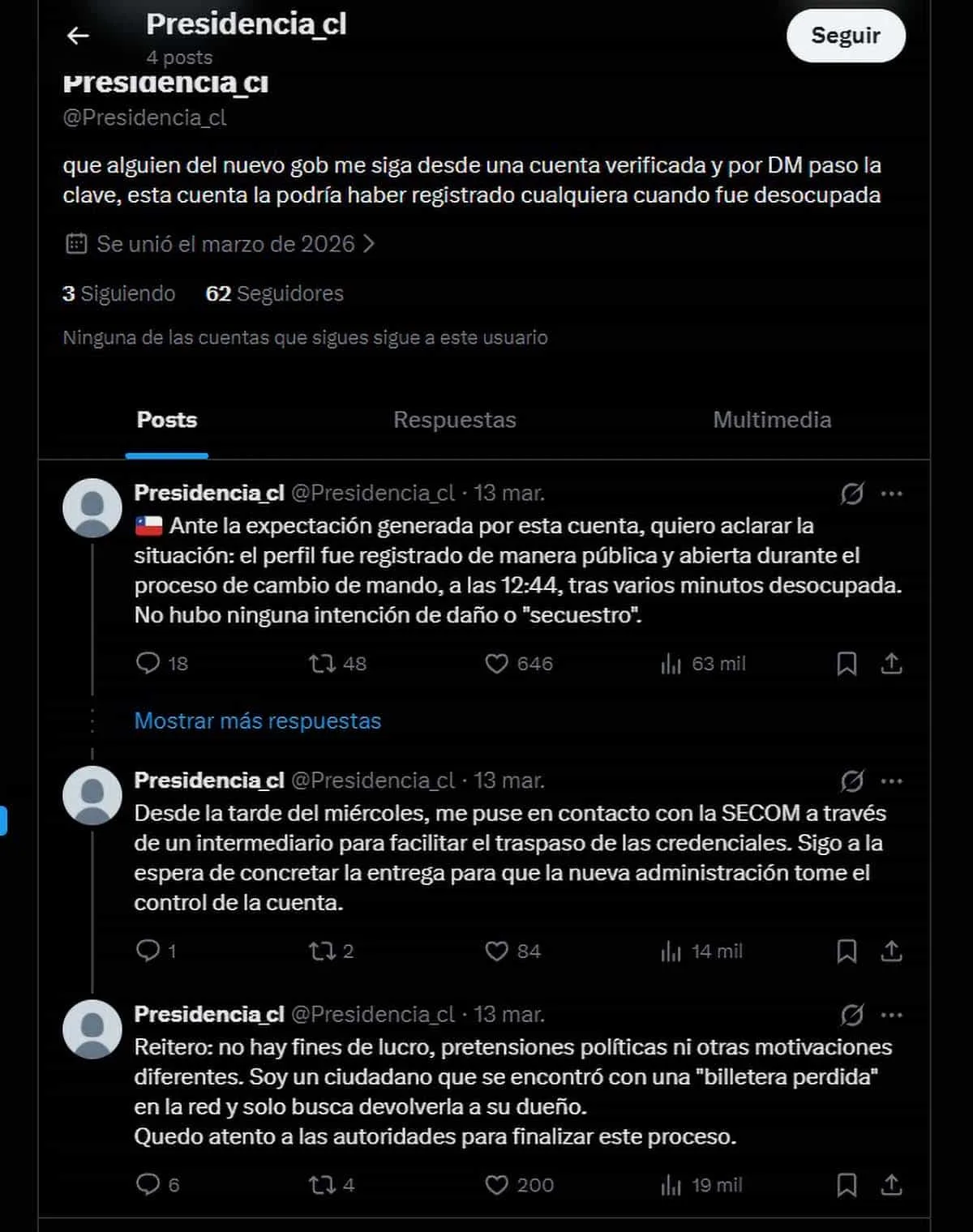 En esa oportunidad, el usuario que accedió a la cuenta señaló su intención de devolverla, indicando que entregaría las credenciales mediante verificación con cuentas oficiales del nuevo gobierno.