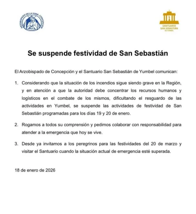 “Considerando que la situación de los incendios sigue siendo grave en la región, y en atención a que la autoridad debe concentrar los recursos humanos y logísticos en el combate de los mismos, dificultando el resguardo de las actividades en Yumbel, se suspenden las actividades de festividad de San Sebastián programadas para los días 19 y 20 de enero.”