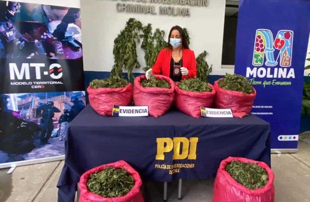 MOLINA, REGIÓN DEL MAULE – Un importante golpe al tráfico de drogas se concretó en la comuna de Molina, luego que detectives del equipo MT-0 de la Brigada de Investigación Criminal (Bicrim) lograran la incautación de 4.594 plantas de cannabis y más de 65 kilos de droga en proceso de secado, en un operativo desarrollado en el sector precordillerano de Agua Fría.