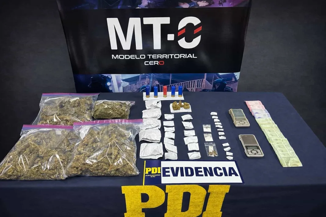 Operativo de la PDI permitió desarticular puntos de venta de droga y decomisar cocaína base, cannabis, dinero y munición.