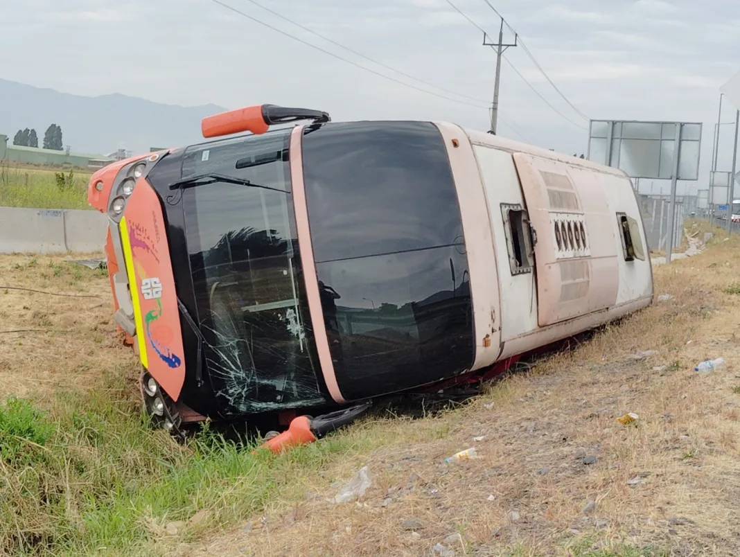 MOSTAZAL, REGIÓN DE O’HIGGINS – Un bus que trasladaba a trabajadores agrícolas de temporada volcó durante la mañana de este lunes en el kilómetro 61 de la Ruta 5 Sur, pista poniente, a la altura del sector cruce Los Lagartos, en la comuna de San Francisco de Mostazal. El hecho dejó al menos 38 personas lesionadas, quienes fueron atendidas por equipos de emergencia y trasladadas al centro de salud comunal.