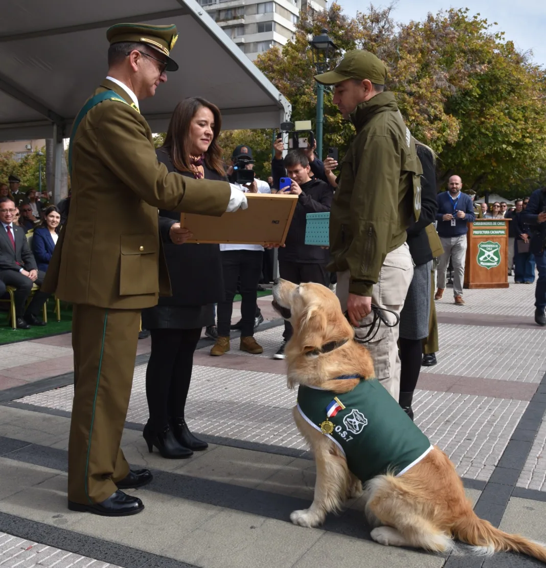 La ceremonia se desarrolló en la Plaza de Los Héroes de Rancagua, instancia en la que la delegada presidencial Susana Pinto, junto al jefe de zona O’Higgins, general Guillermo Bohle Guichacoi, encabezaron el reconocimiento a la labor del ejemplar canino.