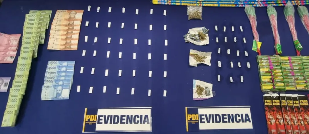 Durante el procedimiento, fueron detenidos dos hombres y dos mujeres, todos chilenos y mayores de edad, una de ellas con antecedentes por infracción a la Ley 20.000. En el lugar se incautaron 422 unidades de pirotecnia, más de 30 gramos de cocaína base, cannabis sativa y dinero en efectivo.
