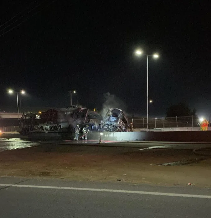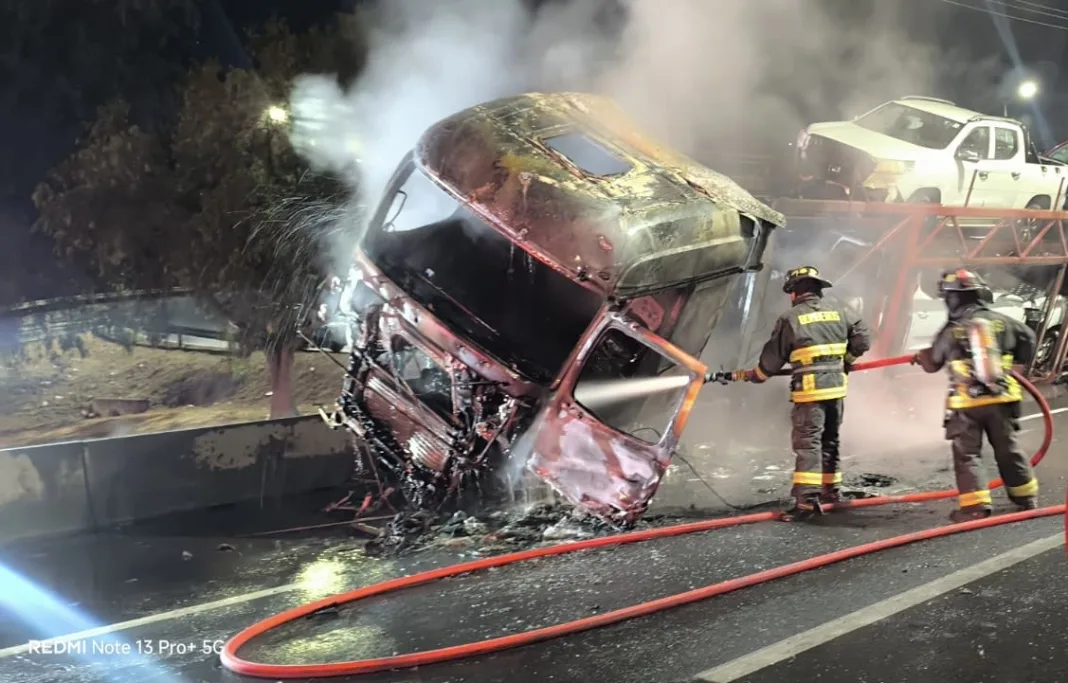 Producto del fuerte impacto, el primer camión comenzó a incendiarse rápidamente, quedando completamente envuelto en llamas y generando una densa columna de humo, lo que obligó a la rápida intervención de equipos de emergencia.