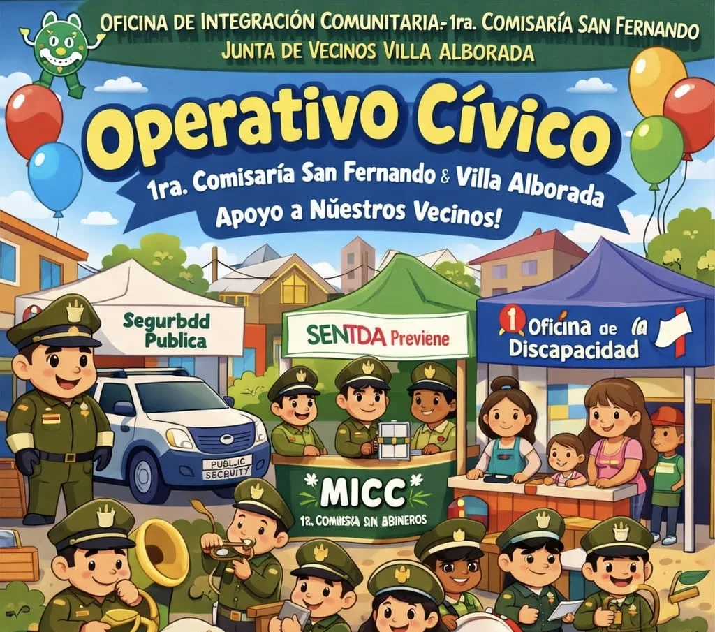 SAN FERNANDO, REGIÓN DE O’HIGGINS – Un operativo cívico organizado por la Oficina de Integración Comunitaria de la 1ª Comisaría de Carabineros de San Fernando, en coordinación con la Junta de Vecinos de Villa Alborada, se desarrollará el jueves 19 de marzo entre las 10:00 y las 12:00 horas en la multicancha ubicada en pasaje Vizcaya con avenida Circunvalación Norte.