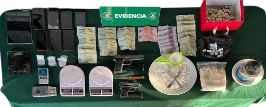 Con la información entregada, personal policial se trasladó rápidamente al domicilio señalado, donde detuvo en flagrancia a un sujeto presuntamente involucrado en los hechos. Durante la inspección del inmueble, se incautaron dos armas de fuego y una importante cantidad de droga.