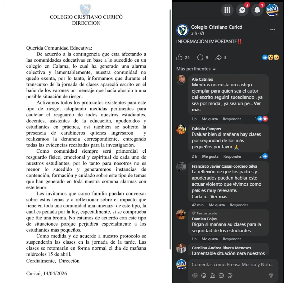 Este caso se suma a otros episodios recientes registrados en Curicó, donde establecimientos educacionales han debido activar protocolos ante amenazas difundidas en redes sociales o mediante rayados en recintos escolares, como ha ocurrido en colegios de la red municipal.