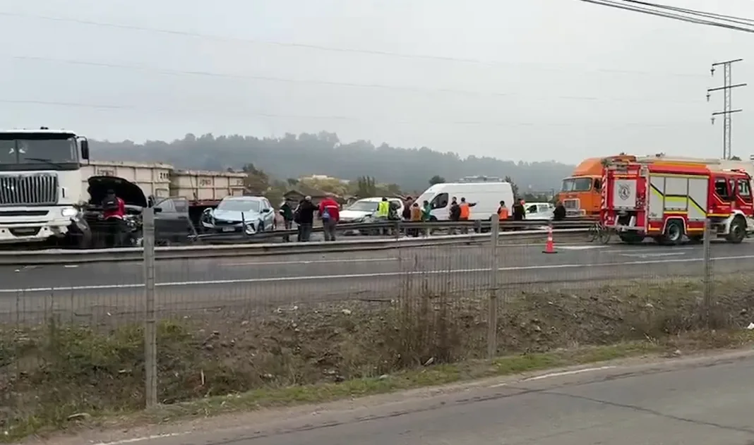 CURICÓ, REGIÓN DEL MAULE – Una colisión múltiple que involucró a dos camiones y al menos cinco vehículos menores se registró cerca de las 08:00 horas de este lunes 6 de abril en la Ruta 5 Sur, kilómetro 190, pista poniente en dirección norte a sur, dejando al menos una persona lesionada.