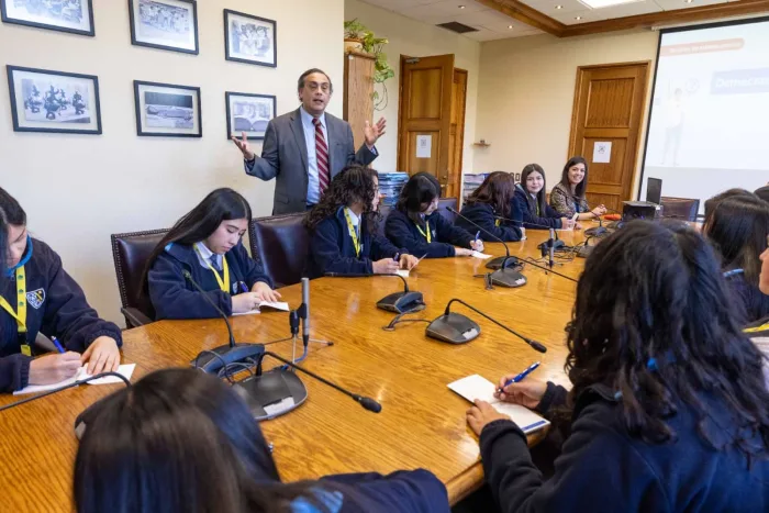 Durante la jornada, las estudiantes de IV medio del Instituto Santa Marta de Curicó participaron en un taller de inducción legislativa, guiado por los abogados ayudantes de comisiones del Senado, Cristián Contador y Luis Díaz, para luego integrarse a una sesión de Sala simulada en el hemiciclo.