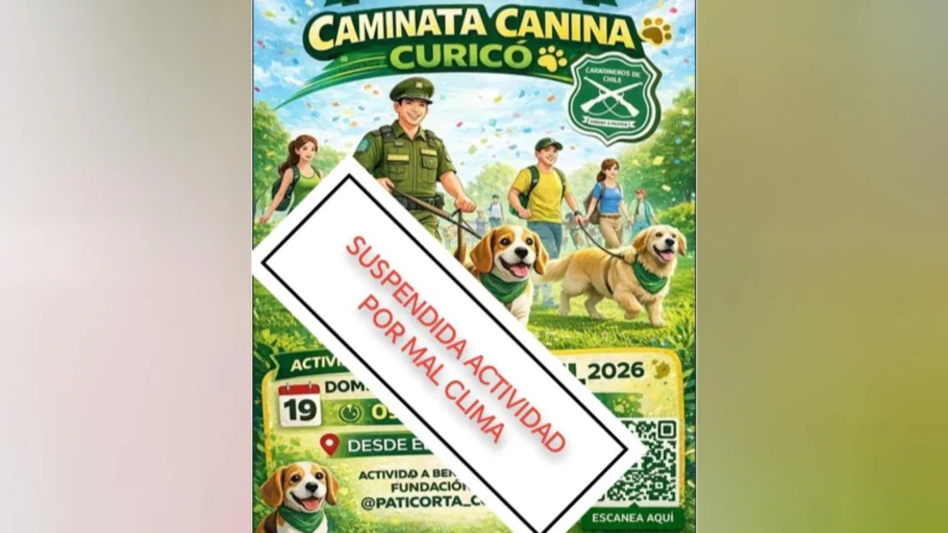 CURICÓ, REGIÓN DEL MAULE – La caminata canina benéfica organizada por Carabineros de Chile en el marco de su 99° aniversario institucional, prevista para este domingo 19 de abril de 2026 en el sector Boulevard del Mall Curicó, fue suspendida debido a las condiciones climáticas adversas que afectan a la zona, siendo reprogramada para el sábado 26 de abril.