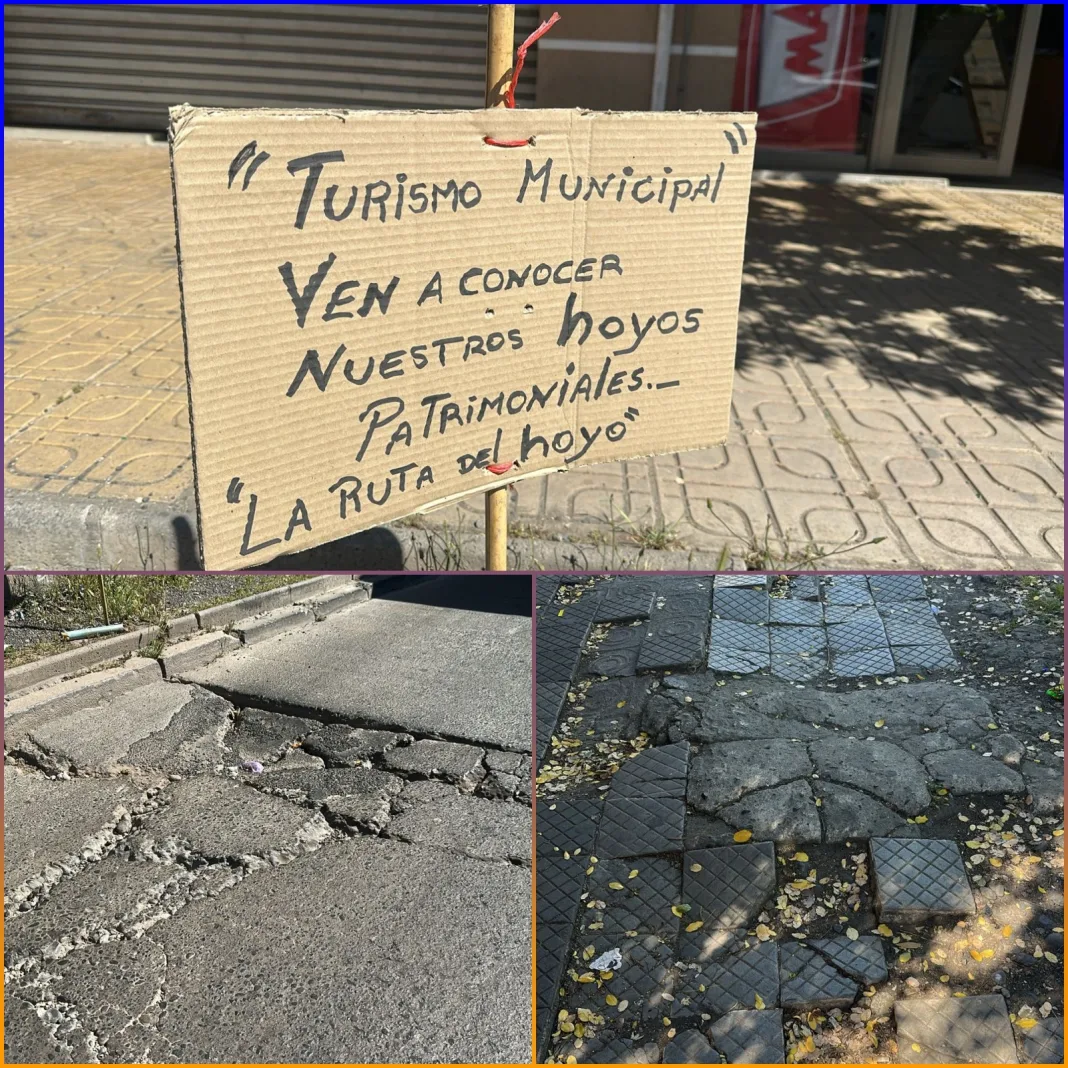 En el cartel se puede leer: “Turismo Municipal: ven a conocer nuestros hoyos patrimoniales, la Ruta del Hoyo”, mensaje que ironiza sobre los grandes baches formados en el pavimento y que se han convertido en un riesgo tanto para peatones como para automovilistas.