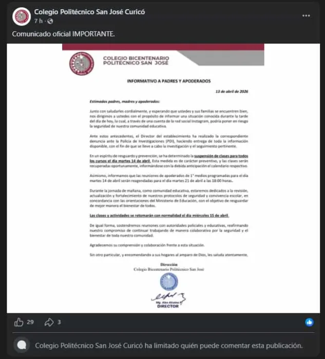 CURICÓ, REGIÓN DEL MAULE – La suspensión de clases para este martes 14 de abril fue informada por el Colegio Bicentenario Politécnico San José de Curicó, tras la detección de una situación que, según el establecimiento, podría poner en riesgo la seguridad de la comunidad educativa, luego de la circulación de contenido a través de redes sociales.