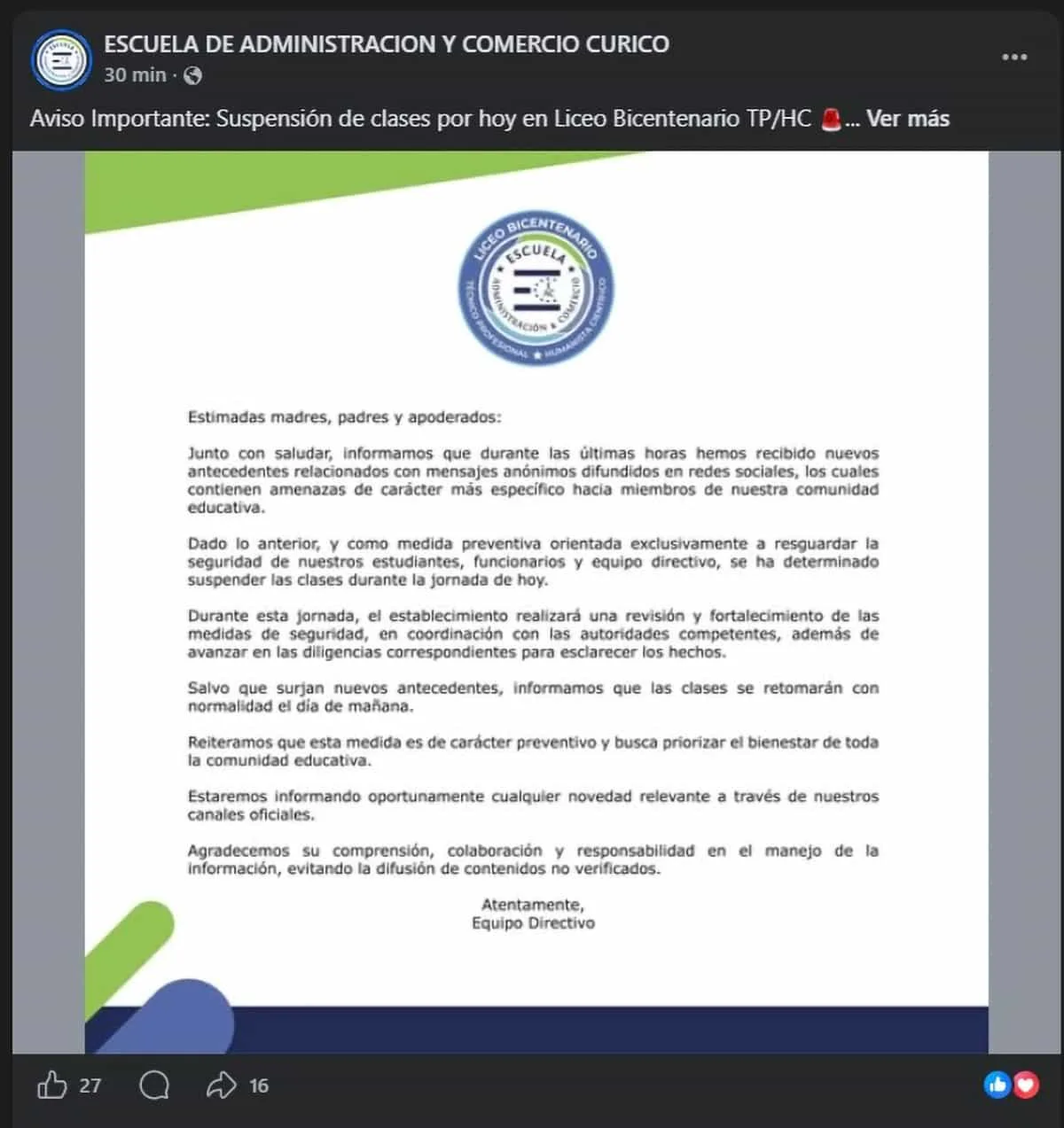 CURICÓ, REGIÓN DEL MAULE – La suspensión de clases durante este lunes 13 de abril fue informada por el equipo directivo de la Escuela de Administración y Comercio de Curicó, ubicada en Arturo Prat s/n, lote 11, localidad de Sarmiento, tras la detección de mensajes anónimos difundidos en redes sociales que contienen amenazas específicas dirigidas a integrantes de la comunidad educativa.