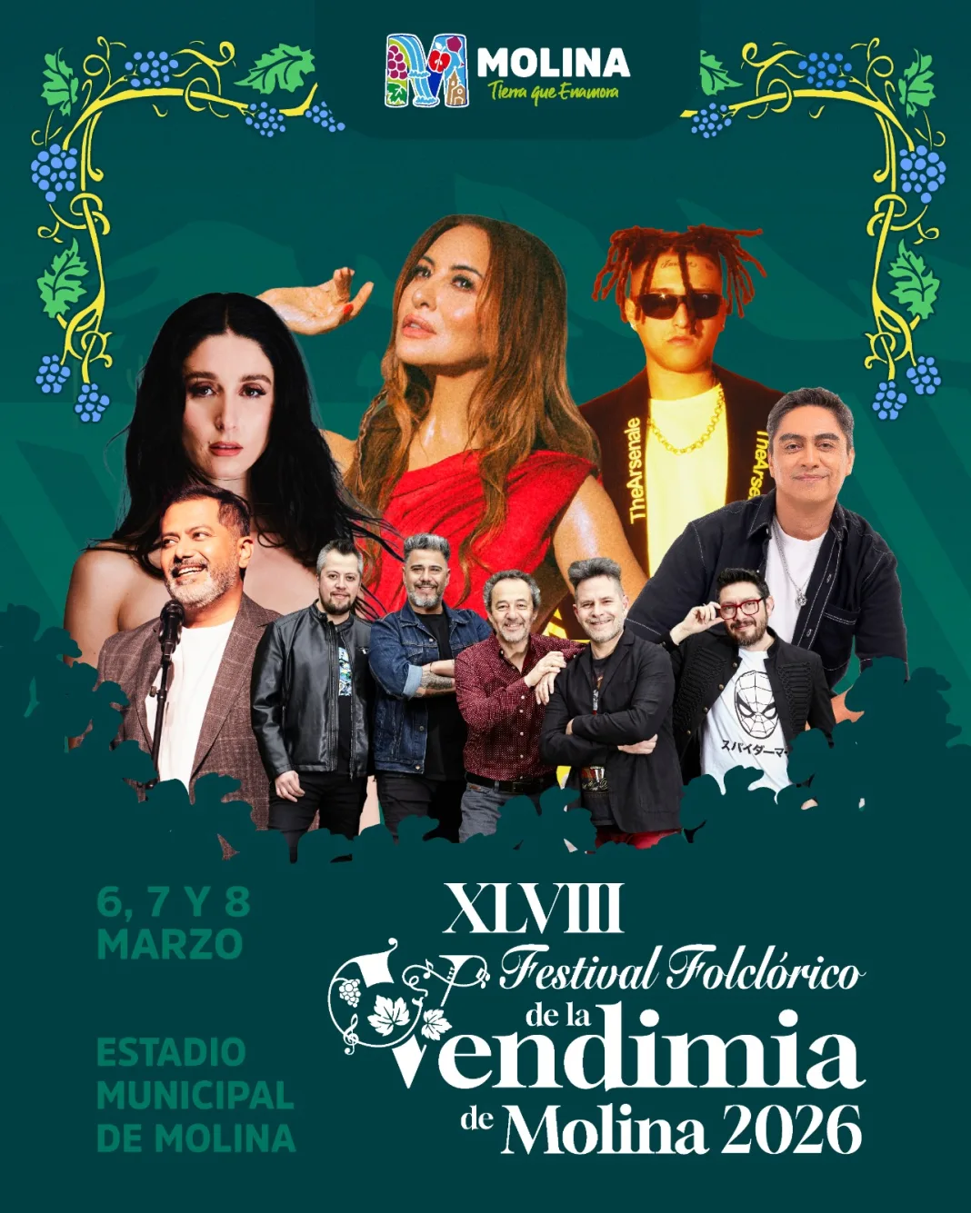 MOLINA, REGIÓN DEL MAULE – La Municipalidad de Molina confirmó oficialmente la parrilla de artistas del XLVIII Festival Folclórico de la Vendimia, evento que se desarrollará entre el viernes 6 y el domingo 8 de marzo en la explanada del estadio municipal, poniendo fin a semanas de especulaciones respecto a los invitados del tradicional certamen veraniego.