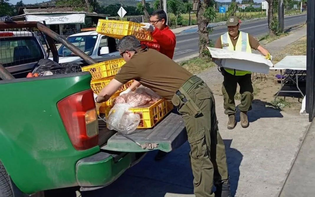 ROMERAL, REGIÓN DEL MAULE – Personal de Carabineros de la Tenencia de Romeral, en coordinación con funcionarios municipales y la Seremi de Salud del Maule, decomisó 59,5 kilos de carne de cerdo que eran vendidos de forma irregular en la Ruta J-55, frente al Cementerio Parroquial de la comuna.