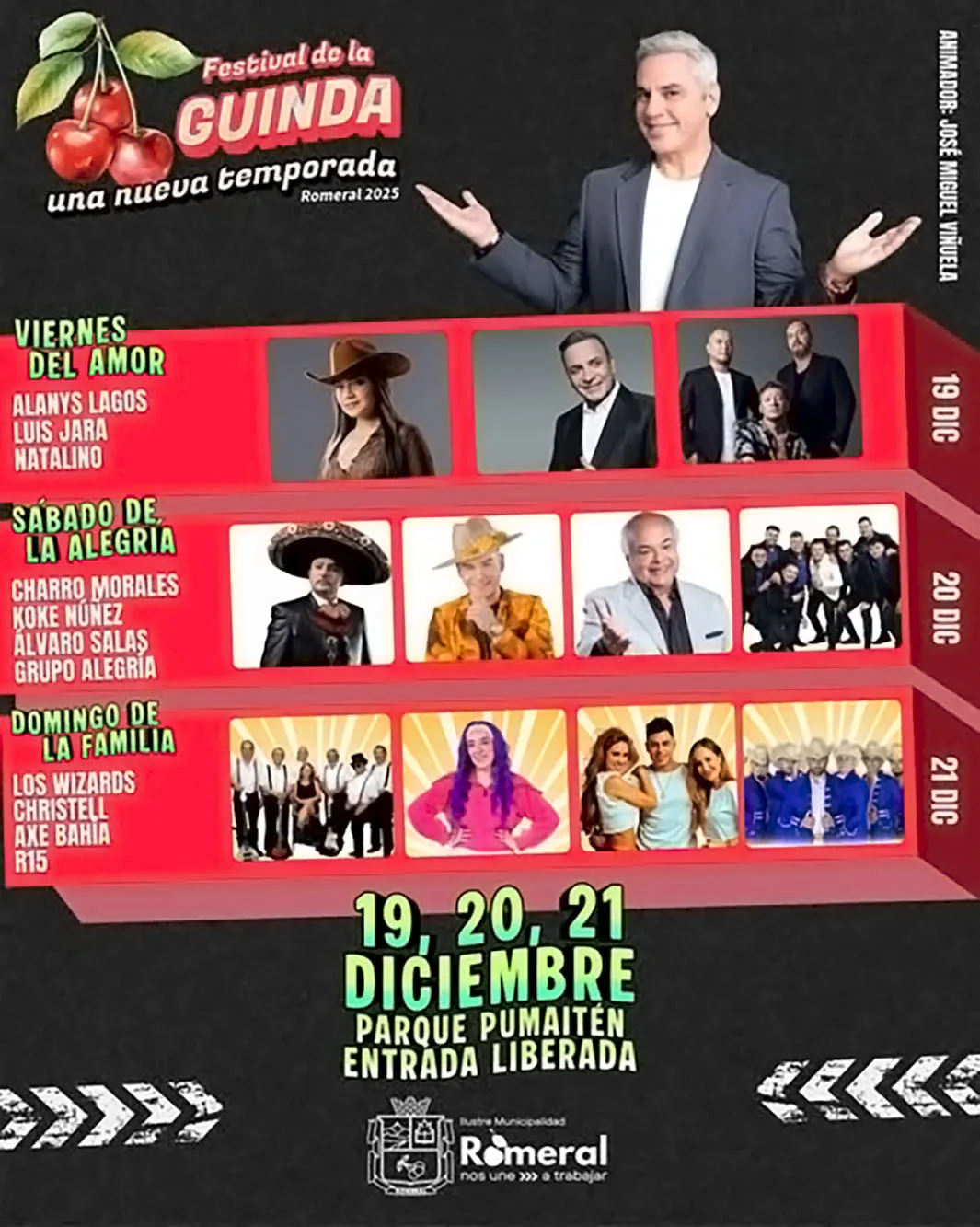 ROMERAL, REGIÓN DEL MAULE – La comisión organizadora del Festival de la Guinda Romeral 2025 confirmó los ocho temas clasificados que competirán en el certamen programado para los días 19, 20 y 21 de diciembre en el Escenario Osvaldo “Lalo” Zapata, ubicado en el Parque Pumaitén. Este año, el evento incorpora por primera vez un tercer día de presentaciones, destinado a fortalecer su carácter familiar y ampliar la oferta cultural de la comuna.