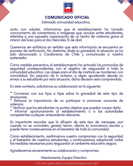 Asimismo, se destacó que la difusión de este tipo de amenazas, incluso si no se concretan, genera temor y afecta la convivencia escolar, por lo que se solicitó informar oportunamente cualquier antecedente a las autoridades.