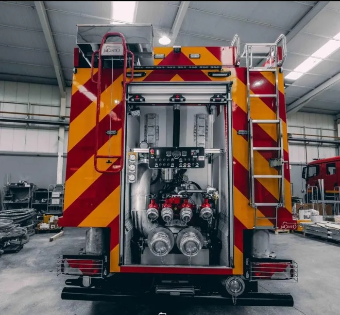 El sistema incluye dos descargas rápidas laterales para abastecimiento directo en piscinas y una piscina plegable instalada en el techo, equipada con tecnología Gentili y con capacidad para 3.500 galones (13.250 litros). En su parte trasera, el carro dispone de dos salidas de 70 mm y dos de 50 mm, además de tres entradas directas al estanque de cuatro pulgadas —dos laterales y una posterior— junto a una entrada de aspiración directa a la bomba de cinco pulgadas. La estructura incorpora también una cortina lateral con capacidad de 6,2 metros cúbicos, destinada al almacenamiento de material operativo.