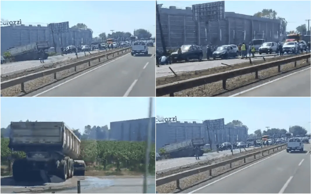 El incidente involucró a un camión con tolva, que transitaba de sur a norte, por causas que aún se investigan, terminó cruzando la calzada, terminado en la pista poninete con la cabina del conductor quedando atrapada en un canal de regadío que se encuentra paralelo a la ruta, frente a la planta Master DOG de la empresa Carozzi.