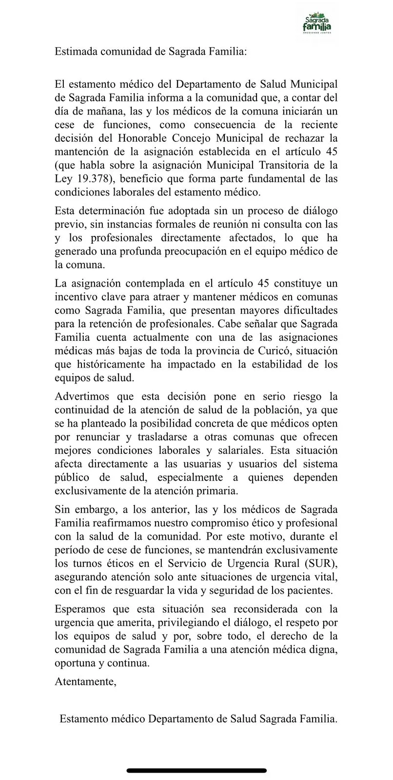 En una declaración pública, las y los médicos de Sagrada Familia expresaron su rechazo a la decisión del Concejo Municipal, señalando que el proceso se adoptó sin instancias formales de diálogo con los profesionales directamente afectados.