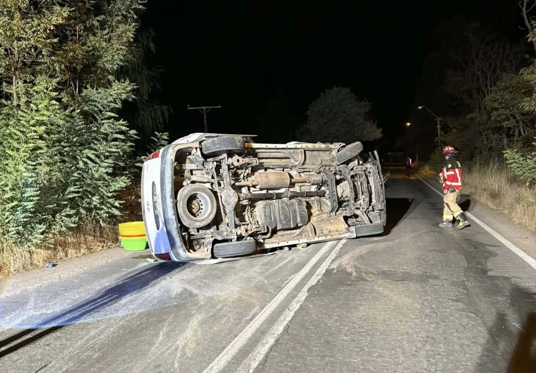 SAGRADA FAMILIA, REGIÓN DEL MAULE – Un accidente de tránsito registrado durante la madrugada de este domingo en el sector Santa Ana, en la ruta J-68, dejó al menos cinco personas lesionadas de diversa consideración, entre ellas menores de edad, tras el volcamiento de un furgón que previamente impactó contra un poste.