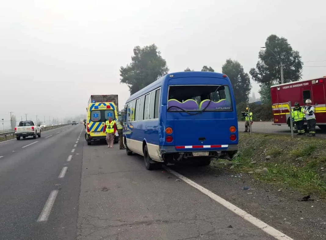 TENO, REGIÓN DEL MAULE – Una colisión entre un minibús de la empresa Teno Bus y un camión de carga se registró durante la mañana de este viernes en la Ruta 5 Sur, a la altura del kilómetro 178, pasado la pasarela de Viluco Alto, en la comuna de Teno, dejando como saldo una persona lesionada.