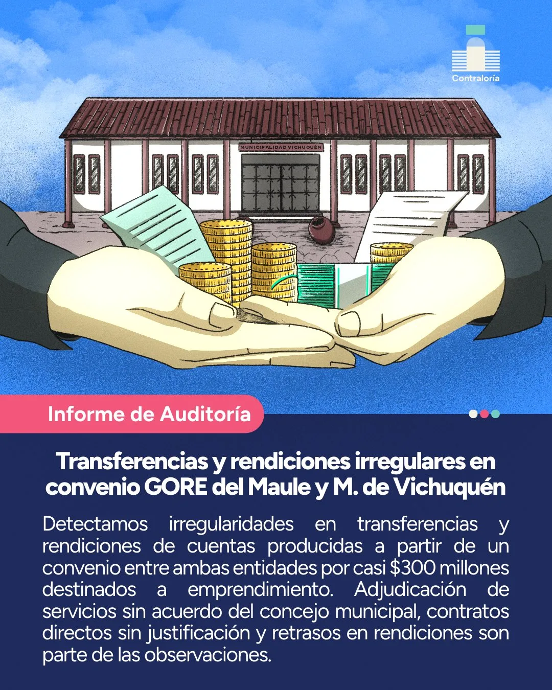 TALCA, REGIÓN DEL MAULE – La Contraloría Regional del Maule (CGR) informó la existencia de transferencias y rendiciones irregulares en el convenio firmado en junio de 2024 entre el Gobierno Regional del Maule (GORE) y la Municipalidad de Vichuquén, por un total de $299.540.000, destinados a un programa de fortalecimiento del emprendimiento en la comuna.