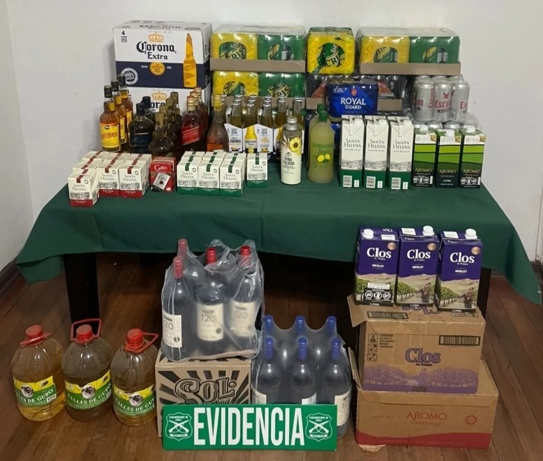 Entre las especies incautadas se contabilizan decenas de cajas y botellas de vino, cerveza, licores y bebidas preparadas, incluyendo marcas como Gran 120, Santa Helena, Clos de Pirque, Átomo, Aromo, Corona, Cristal, Escudo, Mistral, Capel y Johnnie Walker, entre otras.