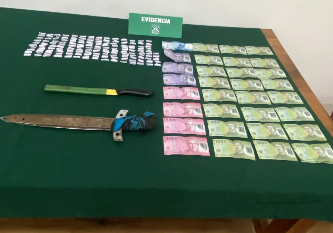 En el procedimiento se incautaron 145 envoltorios con pasta base de cocaína, además de 63 mil pesos en efectivo, un teléfono celular y dos armas blancas tipo cuchillo.