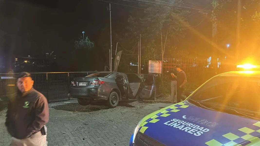 LINARES, REGIÓN DEL MAULE – Durante la madrugada de este sábado 15 de noviembre, un violento accidente vehicular se registró en la intersección de Avenida León Bustos con Quiñipeumo, luego de que un automóvil perdiera el control e impactara con fuerza un poste del tendido eléctrico para posteriormente chocar contra el cerco perimetral de un local comercial.