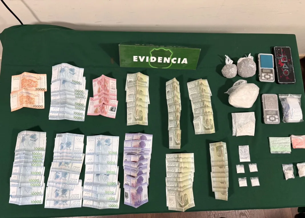 Durante el operativo, Carabineros incautó diversas sustancias ilícitas, entre ellas cannabis sativa, ketamina, cocaína y tussi, además de $558.000 en dinero en efectivo, dos pesas grameras, un teléfono celular y un rollo de bolsas dosificadoras, elementos presuntamente utilizados para la dosificación y comercialización de droga.