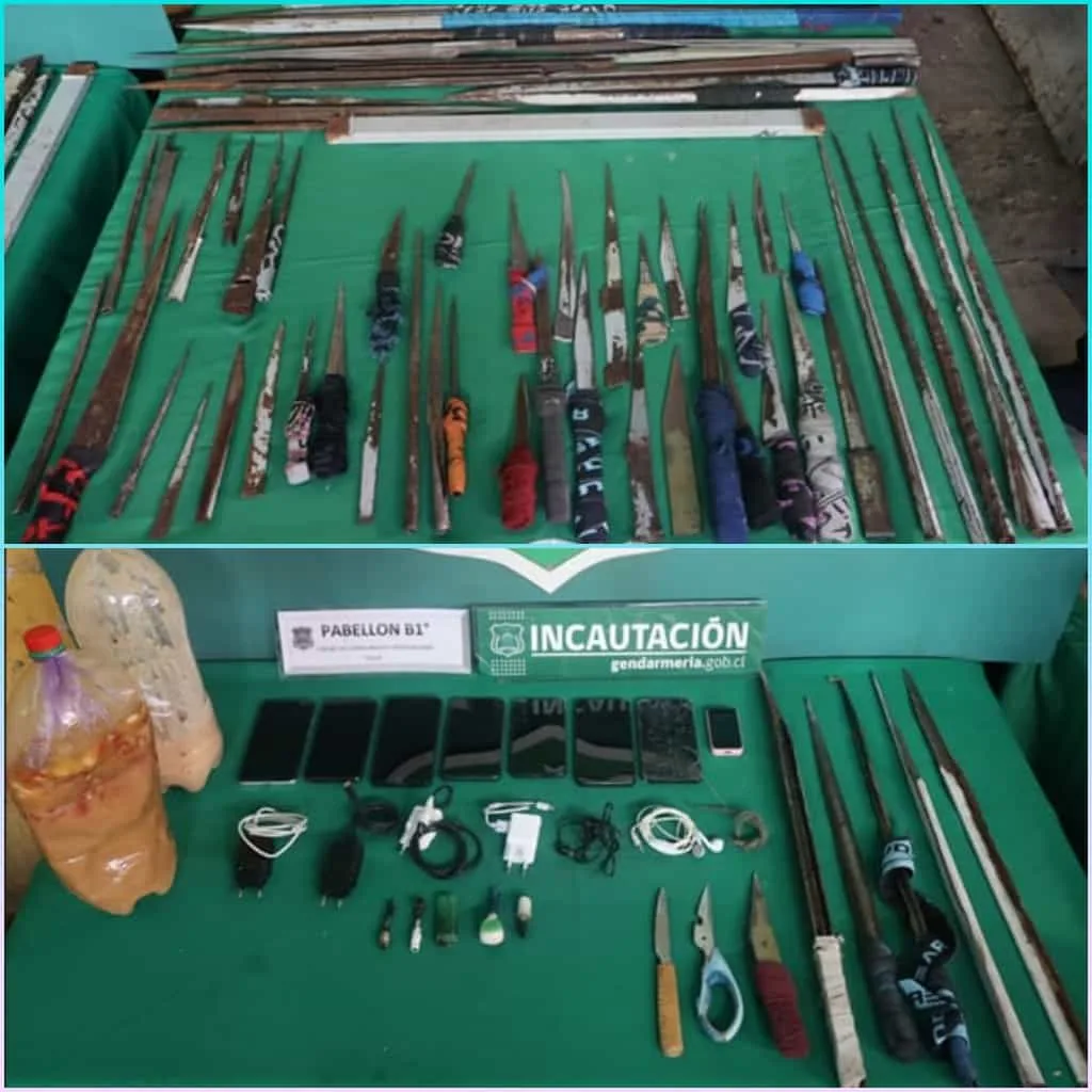 Durante la intervención se logró la incautación de diversos elementos prohibidos, entre ellos 64 armas blancas de fabricación artesanal, ocho teléfonos celulares, seis cargadores, 13 litros de licor artesanal y cinco cables USB, además de otros objetos restringidos al interior del recinto penal.